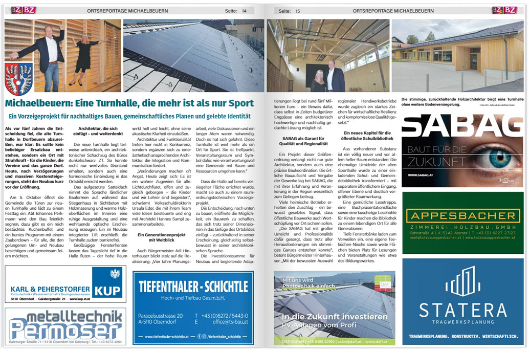 Die neue Sporthalle bzw. Mehrzweckhalle in Michaelbeuern ist ein Vorzeigeprojekt für nachhaltiges Bauen, gemeinschaftliches Planen und gelebte Identität. Die neue Halle liegt teilweise unterirdisch, womit wertvolles Grünland erhalten werden konnte und sich das neue Bauwerk harmonisch in das Ortsbild einfügt. Ein gutes Beispiel dafür, wie verantwortungsvoll eine Gemeinde mit Raum und Ressourcen umgehen kann.
