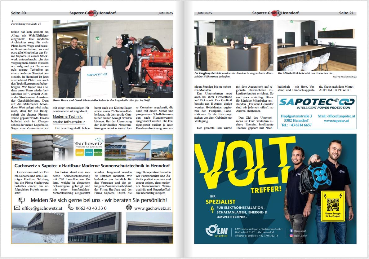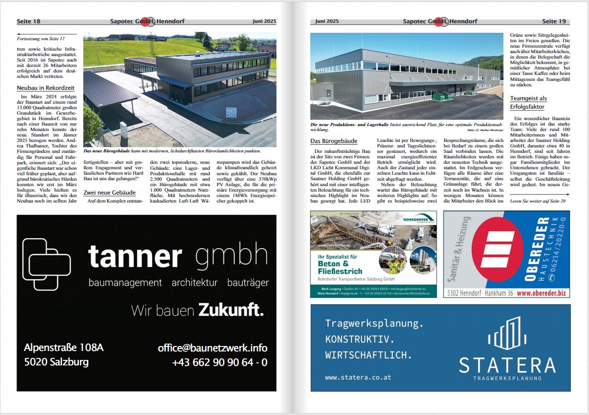 Bereits nach einer Bauzeit von nur zehn Monaten konnte der neue Standort der Firma Sapotec in Henndorf bezogen werden. Das neue Bürogebäude punktet mit modernen, lichtdurchfluteten Büroräumlichkeiten. Die neue Produktions- und Lagerhalle bietet ausreichend Platz für eine optimale Produktionsabwicklung